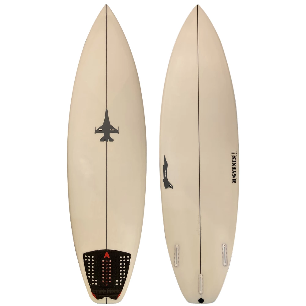Medium entry rocker into high performance tail rocker with a single into double concave into a vee out, fuller nose, wider tail block , three fin boxes set up, typically bump squash tail.