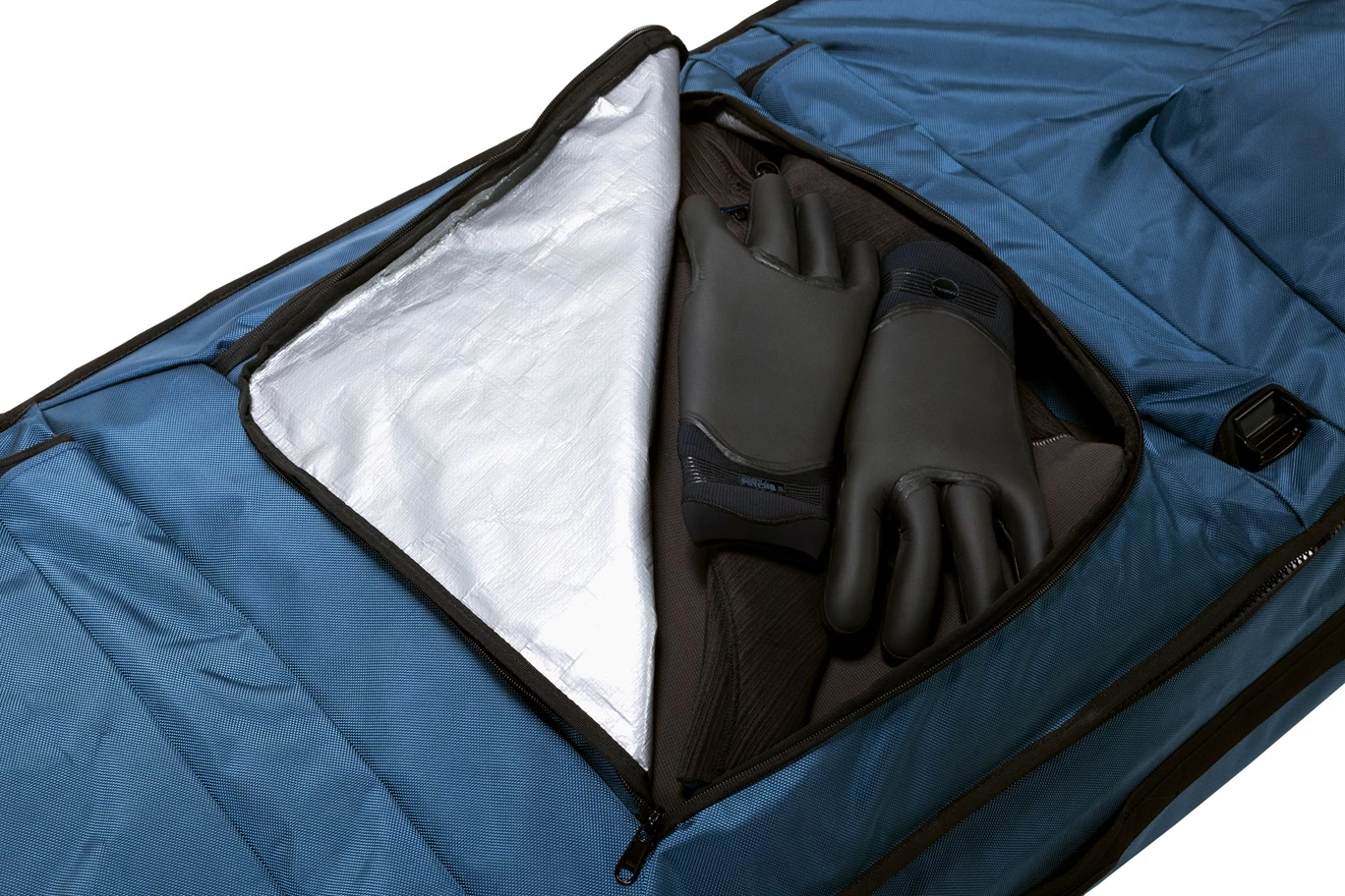 – Wetsuits and accessories pockets. Two accessory pockets and a deep primary compartment large enough to fit two wetsuits and cold weather gear. Pack your clothes with your boards, and everything you need for your trip is contained in one bag.
