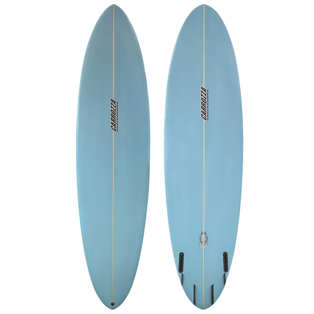 This is a brand new midlength from Carrozza Surfboards. At 7’0″ with a twin fin setup, hard rails and flat deck, this board is going to catch waves like a charm, glide in style, and respond accordingly! The bottom of the board starts with a single concave from the nose, approaching the tail, blends into a double concaved channel bottom out the tail. In a beautiful blue and sand finish, this whip is just in time for summer!